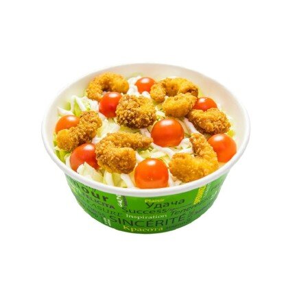 Куриное филе с фрустящей корочкой, помидоры черри, салат айсберг, сыр пармезан, соус цезарь, перец, соль.